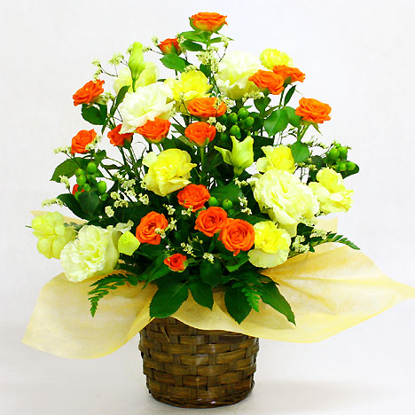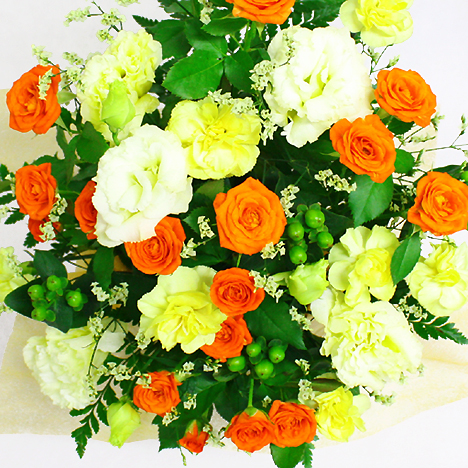 メインにオレンジ系のスプレーバラや季節の花材を使用してアレンジに仕上げます。スプレーバラは色の濃淡は変わる事がございます。