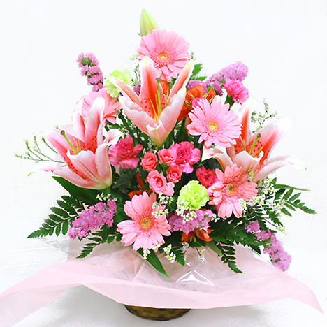 ユリと季節の花材を取り合わせてアレンジに仕上げます。どんなご用途にでもピッタリです。ご用途にあわせて色合いを変更させていただきます。